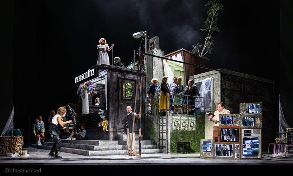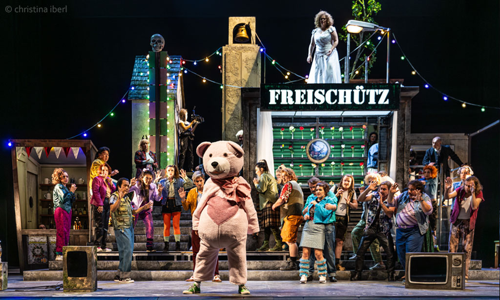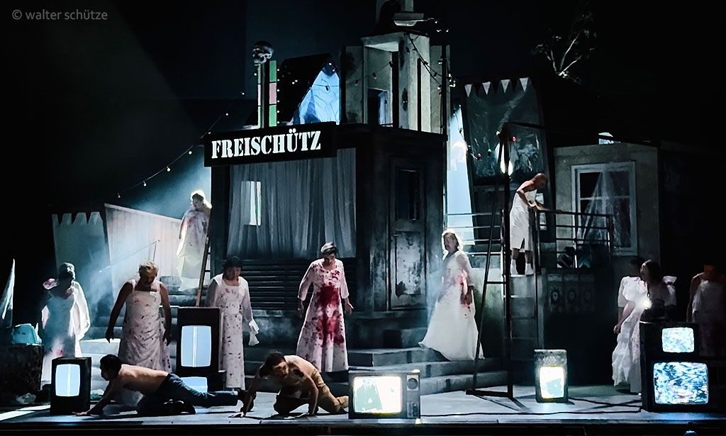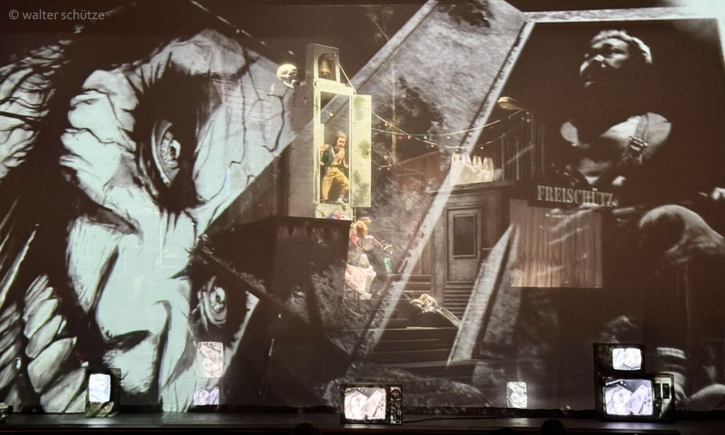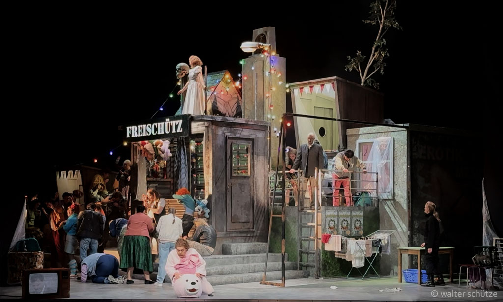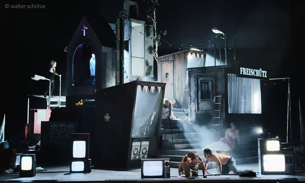 „… Beim neuen Meininger „Freischütz“ gibt es beim ersten Blick auf die Bühne so eine Art Déjà-vu. Diese raumfüllend opulente Konstruktion, die Ausstatter Walter Schütze da auf die Drehbühne gestellt hat, erinnert durchaus an die Bühnenbildwunderwerke von Frank Castorfs Ausstatter Alexandar Denic. Es sind Hingucker, mit viel Liebe zum assoziativen Detail aus der Wirklichkeit, oder einem Traum von Wirklichkeit, abgelauscht. In dem Falle mit Glockenturm und Hau-den-Lukas, mit Schießbude und Dixiklo. Genau der Raum für eine veritable Dorfplatzsauferei, kollektives Max-Mobbing und aus dem Ruder laufendem Junggesellenabschied. …“
