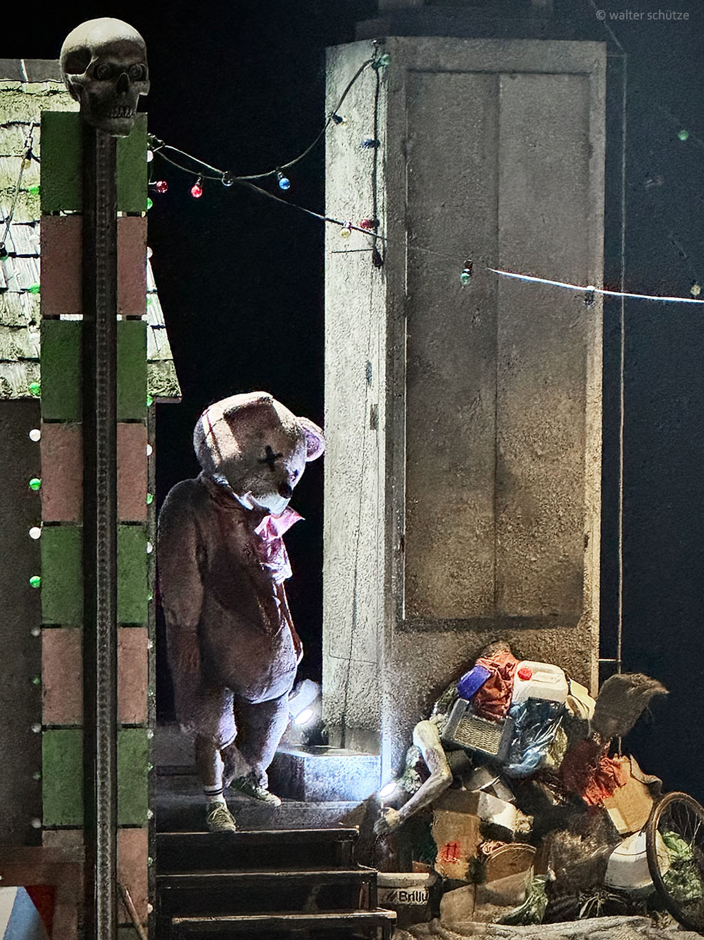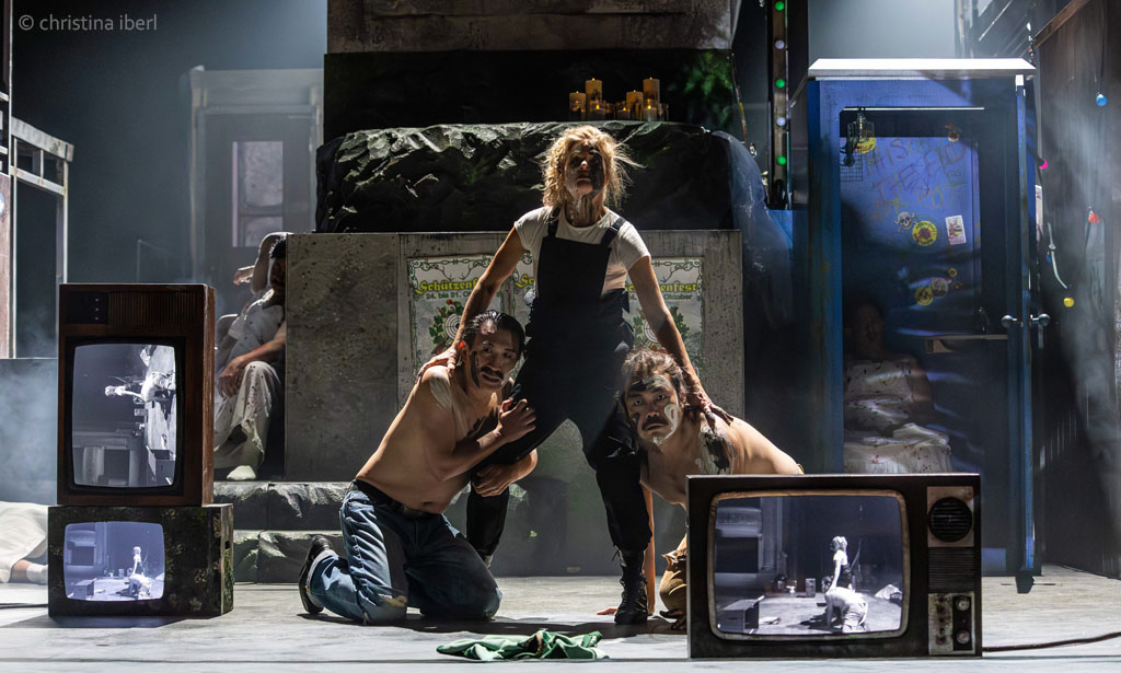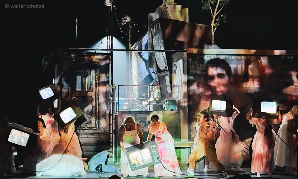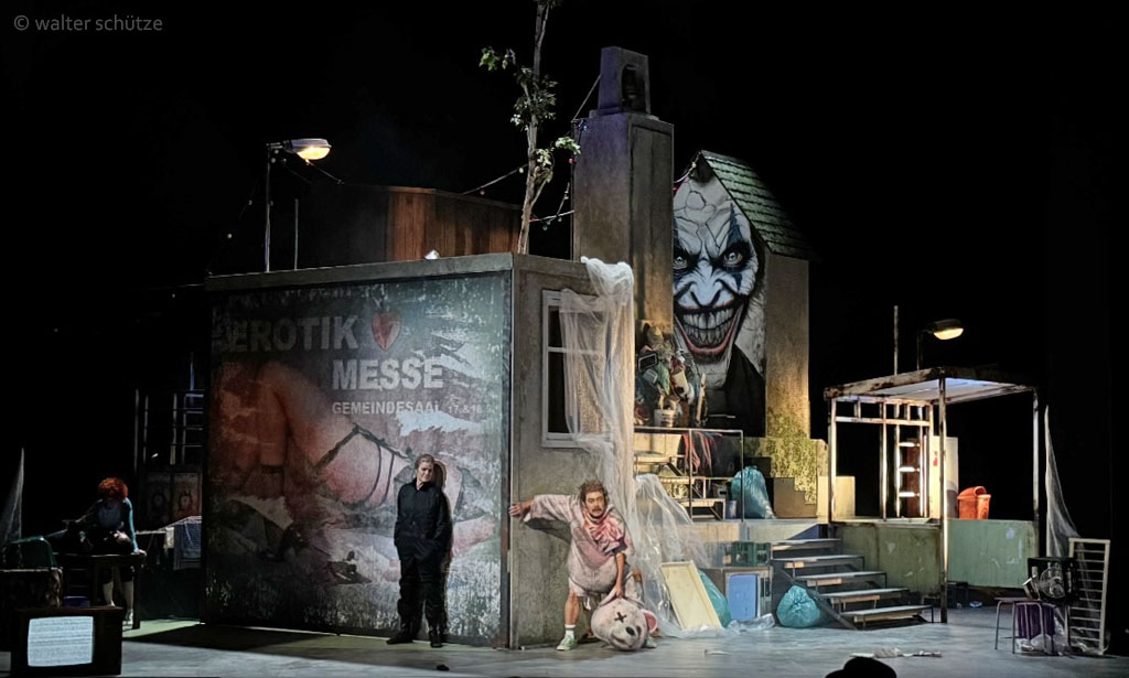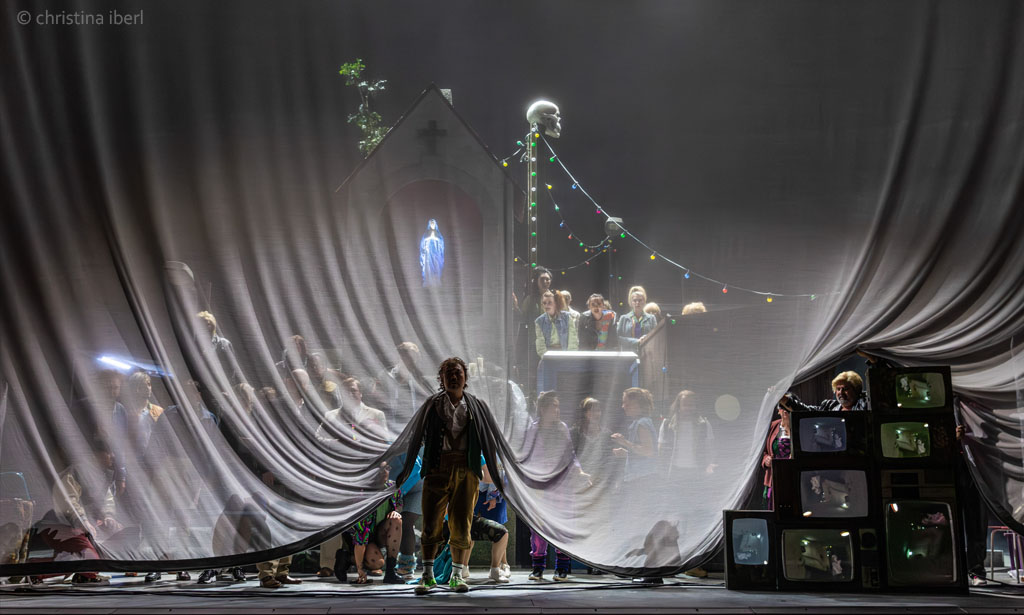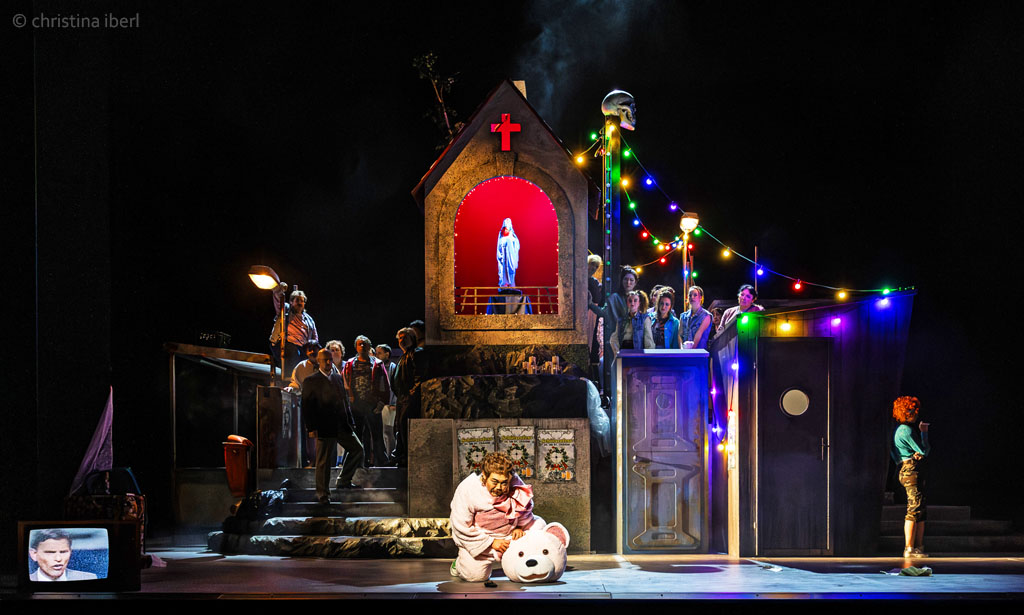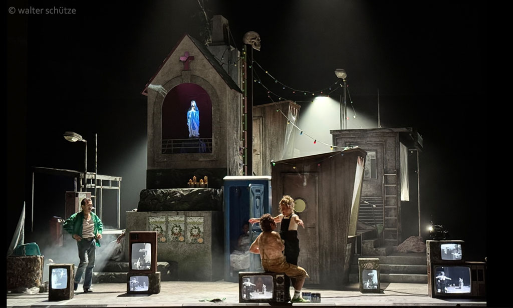 „… Ausstatter Walter Schütze hat ein Konstrukt aus lauter Versatzstücken eines ziemlich heruntergekommenen Dorfes in einer abgehängten Gegend von heute auf die Drehbühne gesetzt. Ein Raum, in dem die überkommenen Rituale etwas sind, an dem sich alle festhalten. Eine vergammelte stillgelegte Bushaltestelle, eine einsame kitschige Marienfigur, ein transportables WC-Häuschen, Müll vor der Tür. Wenigstens eine einsame Straßenlaterne funktioniert noch. Und der Rummel. Neben einem Betonglockenturm überragt ein Totenkopf auf einer Hau-den-Lukas-Apparatur diesen Dorfalbtraum. Das Plakat, das zur Erotikmesse im Gemeindehaus wirbt, ist auch schon verwittert. Die Realität, die mit all dem eingefangen und übersetzt wird, ist alles andere als schön. Als Bühnenbildkunstwerk ist diese Versatzstückarchitektur ein Wurf. …“