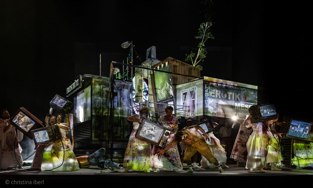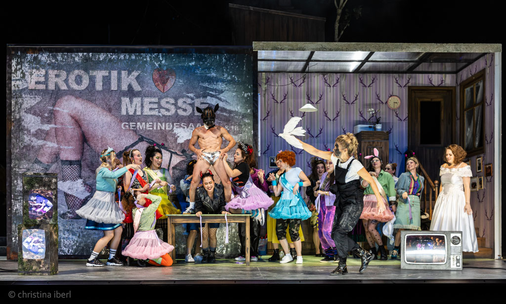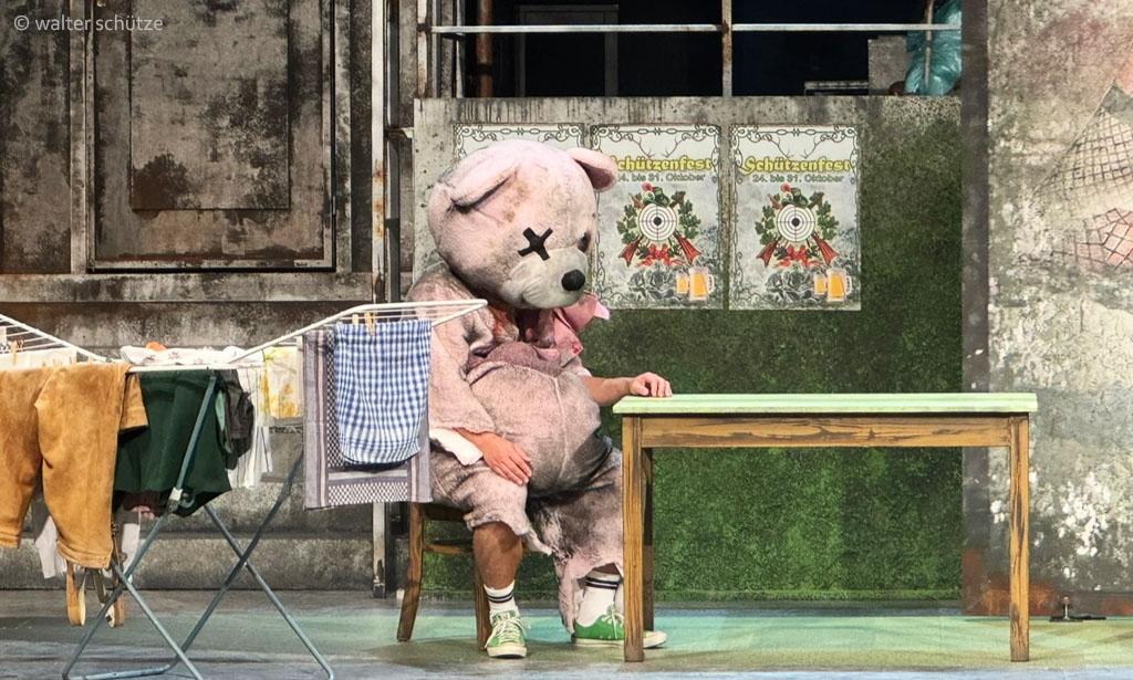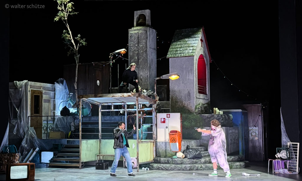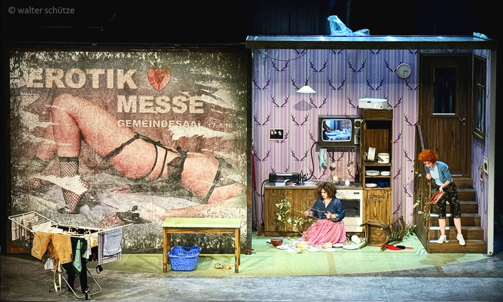 „… Starkes Drehbühnenbild. Was […] wirklich gelungen ist und Eindruck macht, ist das Bühnenbild von Ausstatter Walter Schütze. Die Drehbühne beherrscht eine Melange aus Dorfplatz mit Schießbude und Hau den Lukas mitten in den Versatzstücken eines desolaten, von der Welt abgehängten, aber ihr nachhechelnden Dorfes von heute. Inklusive eines verwitterten Werbeplakates für eine Erotikmesse im Gemeindehaus. Dahinter verbirgt sich das biedere Wohnzimmer Agathes, in dem der Fernseher das Tor zur Welt ist. …“