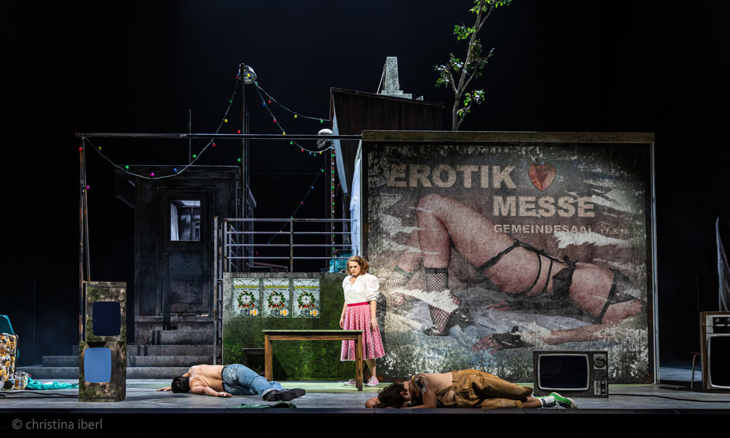 „… Philipp M. Krenn hat sich von Walter Schütze ein tolles Bühnenbild auf die Drehbühne stellen lassen. Das ist so ein arg ramponiertes Dorf Mitte der 90er Jahre im Osten. Es gibt eines dieser damals allgegenwärtigen Plakate, das zum Erotik-Markt im Gemeindesaal einlädt. Es gibt eine Bushaltestelle, wo schon lange kein Bus mehr abgefahren ist, eine verschimmelte Kapelle mit einer Madonnenstatur. Tolles Bild. Bleibt den ganzen Abend über geheimnisvoll. …“